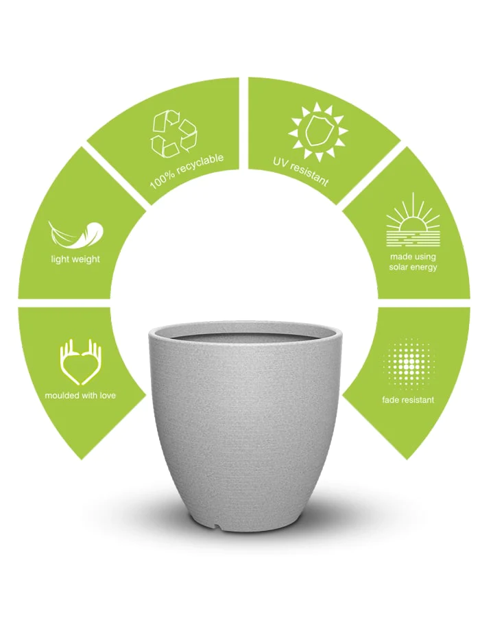 Light weight durable Round planters made from UV stabilised and non-fading colours. These contemporary wide mouth design planters can be used as external decorative elements for your inner pots or filled with light weight soil to grow you plants directly.