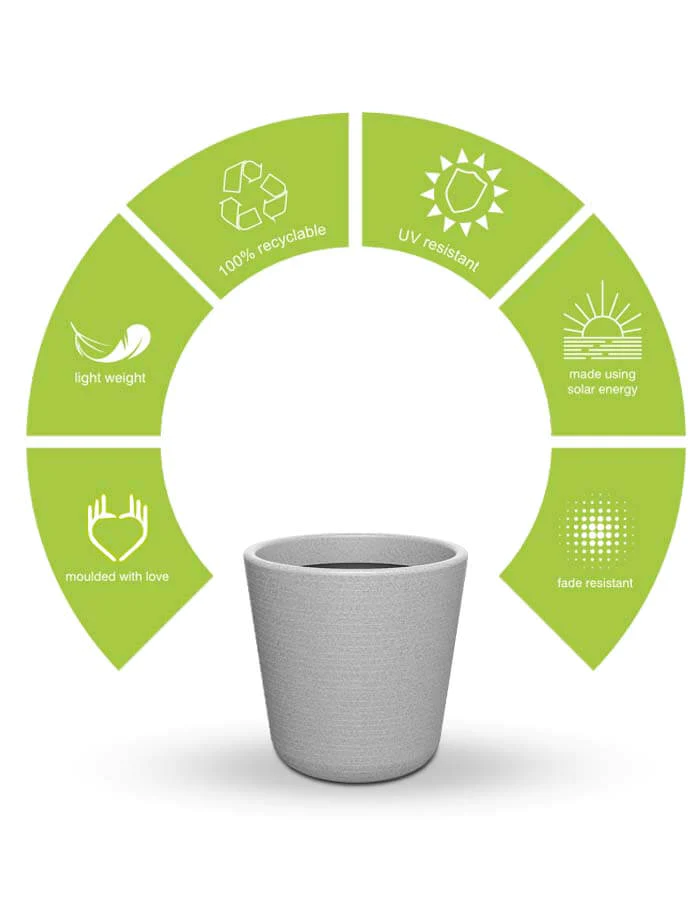 Light weight durable round planters made from UV stabilised and non-fading colours. These contemporary design planters can be used as external decorative elements for your inner pots or filled with light weight soil to grow you plants directly.